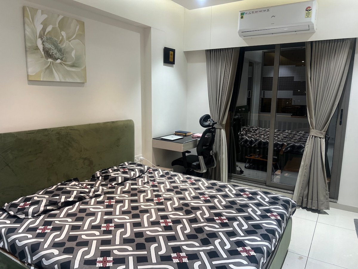 This flat is master bedroom and a small bedroom equipped with fully utilitarian kitchen, study and lounge area is available for a peaceful and a long term stay. Extra bedding space and equipment is also available. 5kms from airport. 1kms from 2 separate malls. 2 kms local market 1.5 kms is a multi speciality hospital