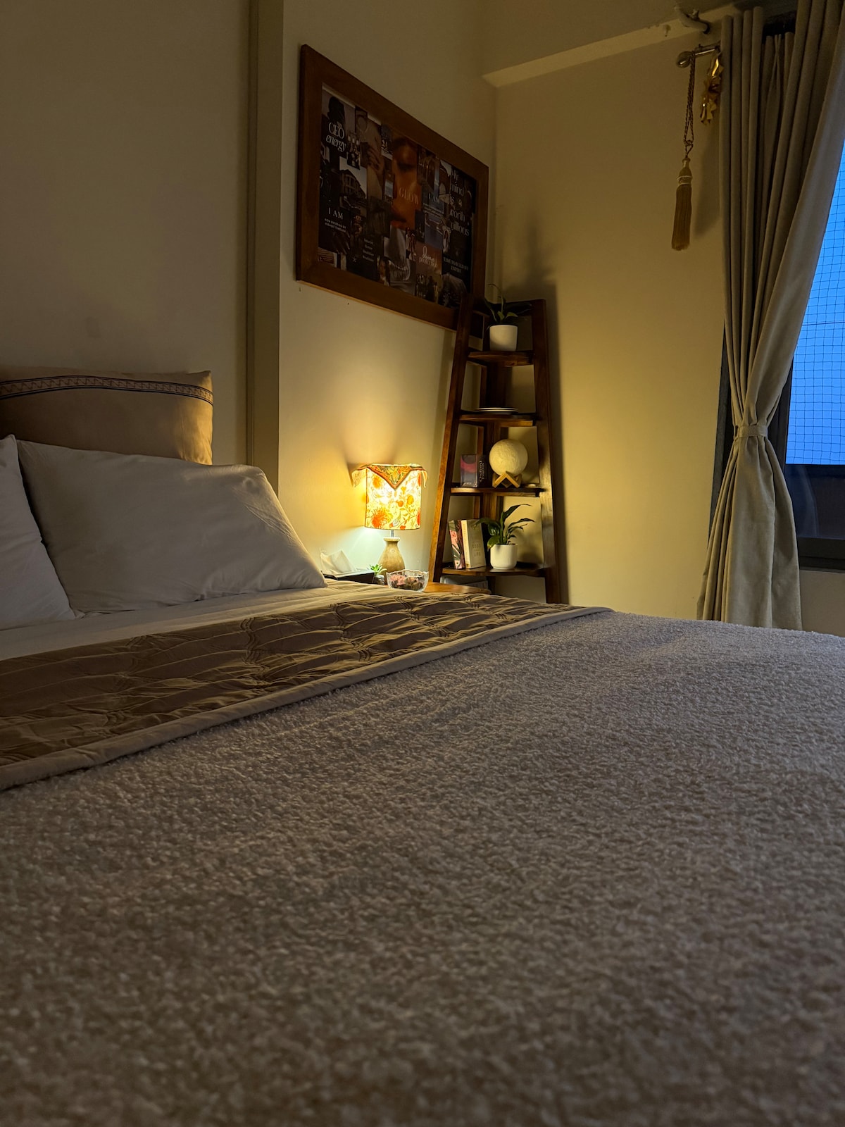 This flat is master bedroom and a small bedroom equipped with fully utilitarian kitchen, study and lounge area is available for a peaceful and a long term stay. Extra bedding space and equipment is also available. 5kms from airport. 1kms from 2 separate malls. 2 kms local market 1.5 kms is a multi speciality hospital