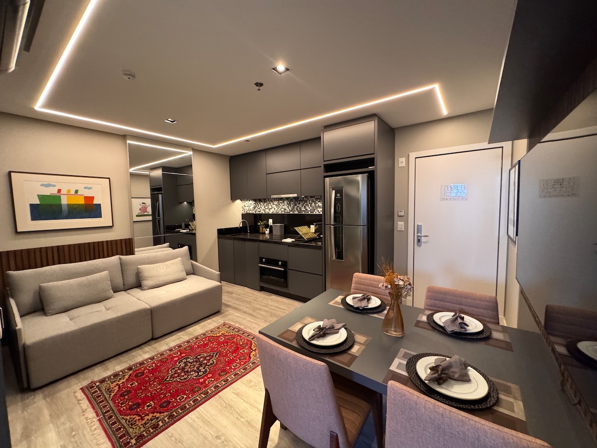 Cada detalhe do apto foi pensado para transmitir a leveza, elegância e aconchego do mar Mediterrâneo. Tons suaves, texturas naturais e iluminação planejada criam o ambiente ideal para dias inesquecíveis. 2 suítes, com ar condicionado e TV 4K. Sala de jantar e estar com TV 65". Cozinha equipada para jantares memoráveis. Sacada gourmet com churrasqueira e vista para o mar. No Rooftop, Piscinas aquecidas, perfeitas para banhos relaxantes até mesmo no inverno e academia totalmente equipada.