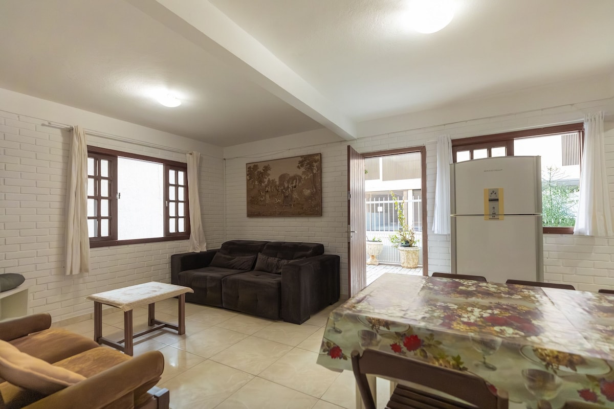 With a privileged location, Praia Alegre at the end of the street has beautiful sunsets, calm seas, and beachfront restaurants. Bringing children? Talk to the host beforehand. We do not have extra bath towels, bed linens, or a crib. Upper floor: • Bathtub with hydromassage for two • Hot/cold air conditioning • Floating double bed (LED) Ground floor: • Kitchen with barbecue • Hot/cold air conditioning • Living room with sofa bed (2.00 x 1.30 m) and 50' smart TV • Fiber optic Wi-Fi