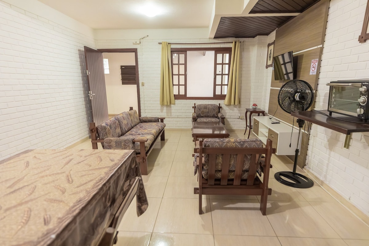 Chalé à beira mar da Praia da Saudade. Vila familiar, acomoda no máxima 6 pessoas. Imóvel completo com 3 quartos, 1 banheiro completo, 1 lavabo, copa, cozinha, garagem coberta, varanda , churrasqueira. Deixamos roupas de cama. 2 quartos com ar condicionado ( segundo piso), 1 quarto com ventiladores( mezanino terceiro piso). * Não é permitido a entrada de VISITAS. * Não é permitido o uso de som automotivo ou qualquer aparelho sonoro.