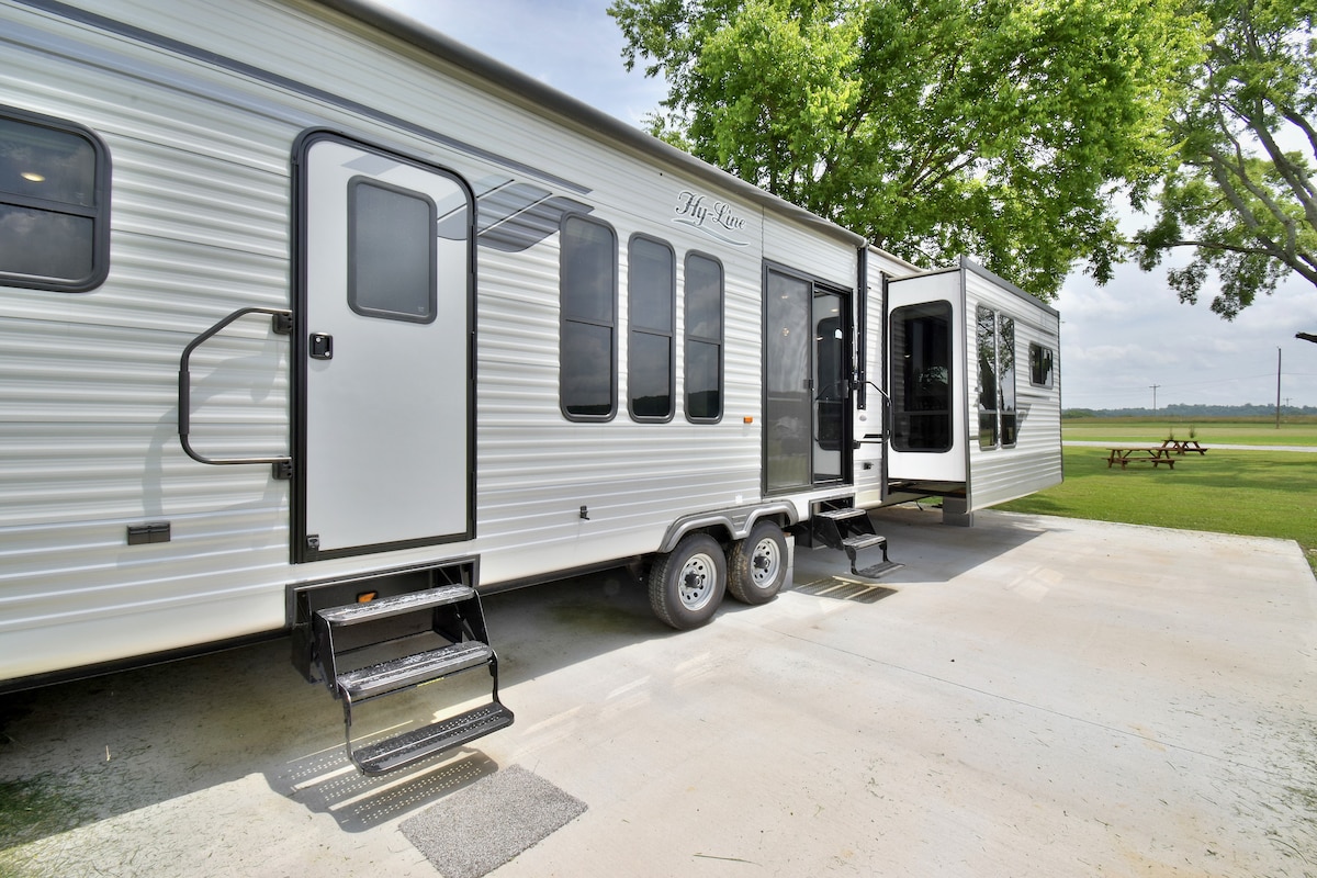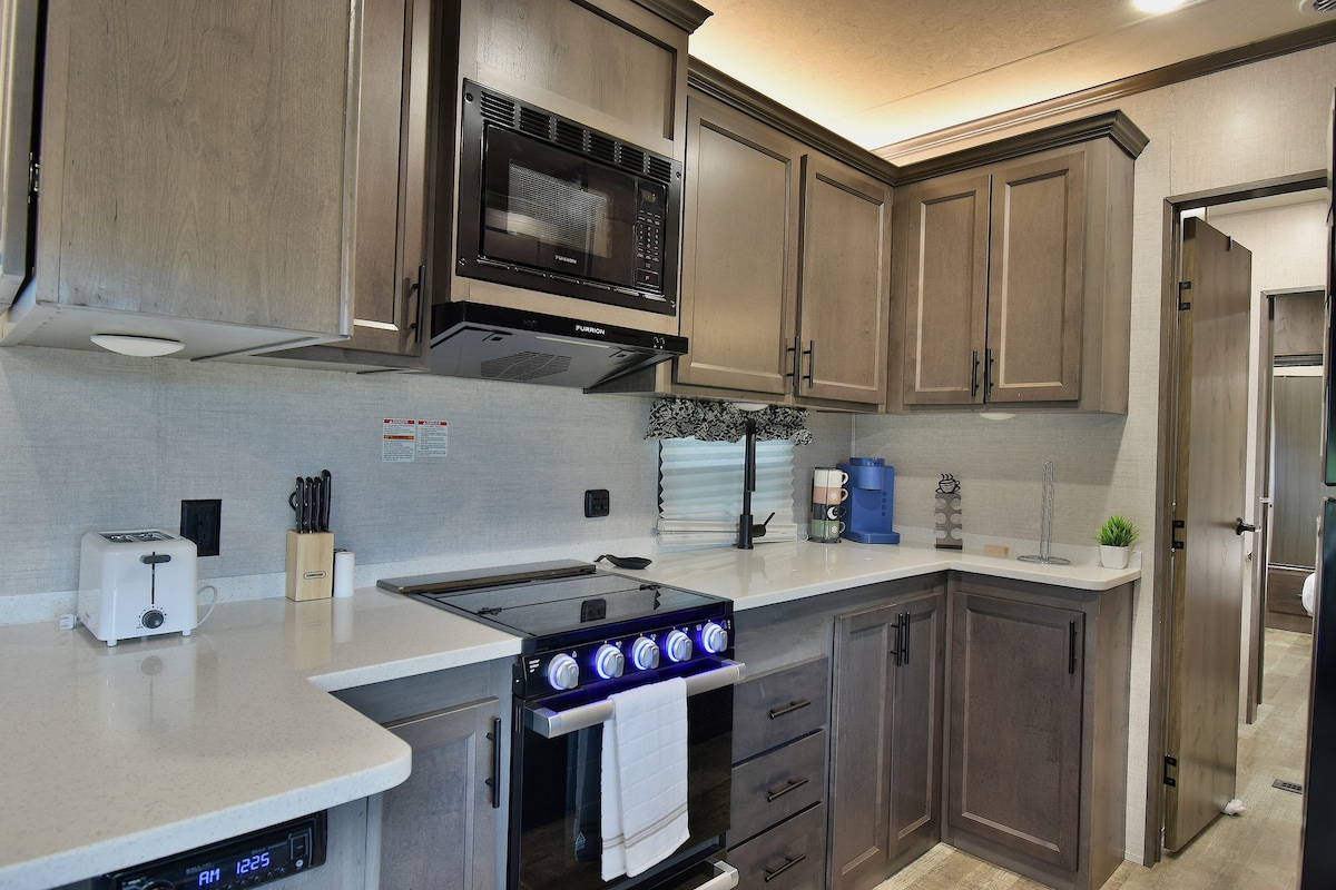 Premium RV w/ private lawn, full park view, fire pit, grill, picnic table & parking. Sleeps 4 (queen bed + pullout). Full-size kitchen, Keurig w/ C2 Custom Grinds coffee. Sanitized & pest-controlled. 10 min to Watts Bar Lake. 45 min to Knoxville. 1 hr to Gatlinburg.