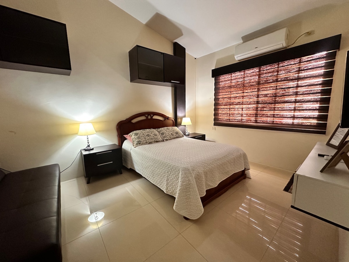 Disfruta de una experiencia con estilo en esta suite ubicada frente al centro comercial más importante de la ciudad. Una zona segura y con todas las facilidades a pocos metros de ti. 1 habitación master con baño privado Sala/ comedor con baño social. Sofá cama Patio con hamaca Refrigeradora y cocina completa. TV Smart Aire acondicionado Estacionamiento privado gratuito Farmacias y áreas comerciales muy cerca Perfecto para parejas o viajeros solos que buscan comodidad y ubicación privilegiada.