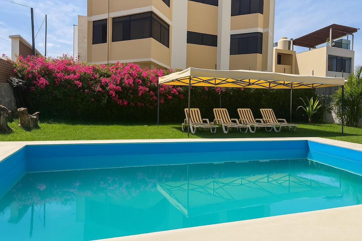 Relájate con toda la familia en este tranquilo lugar para quedarse en vacaciones. Contarás con una casa completa con amplia piscina en el primer piso, acceso directo a la playa, terraza con parrilla, agua caliente, todos los servicios y completamente amoblada. Además podrás disfrutar de las instalaciones de nuestro condominio como canchas de froton, tenis, fulbito, Voley, piscinas y fogateros en la playa. Ideal para familias.
