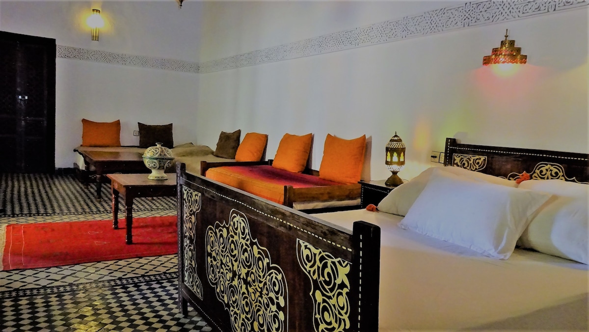 R´Mila Medina Fez is a small hotel with 6 rooms. Its a quit hotel, only for adults. This beautiful double en-suite room is situated on the first floor overlooking the plunge pool, it benefits from air conditioning in the summer months. It has an en-suite shower wc room