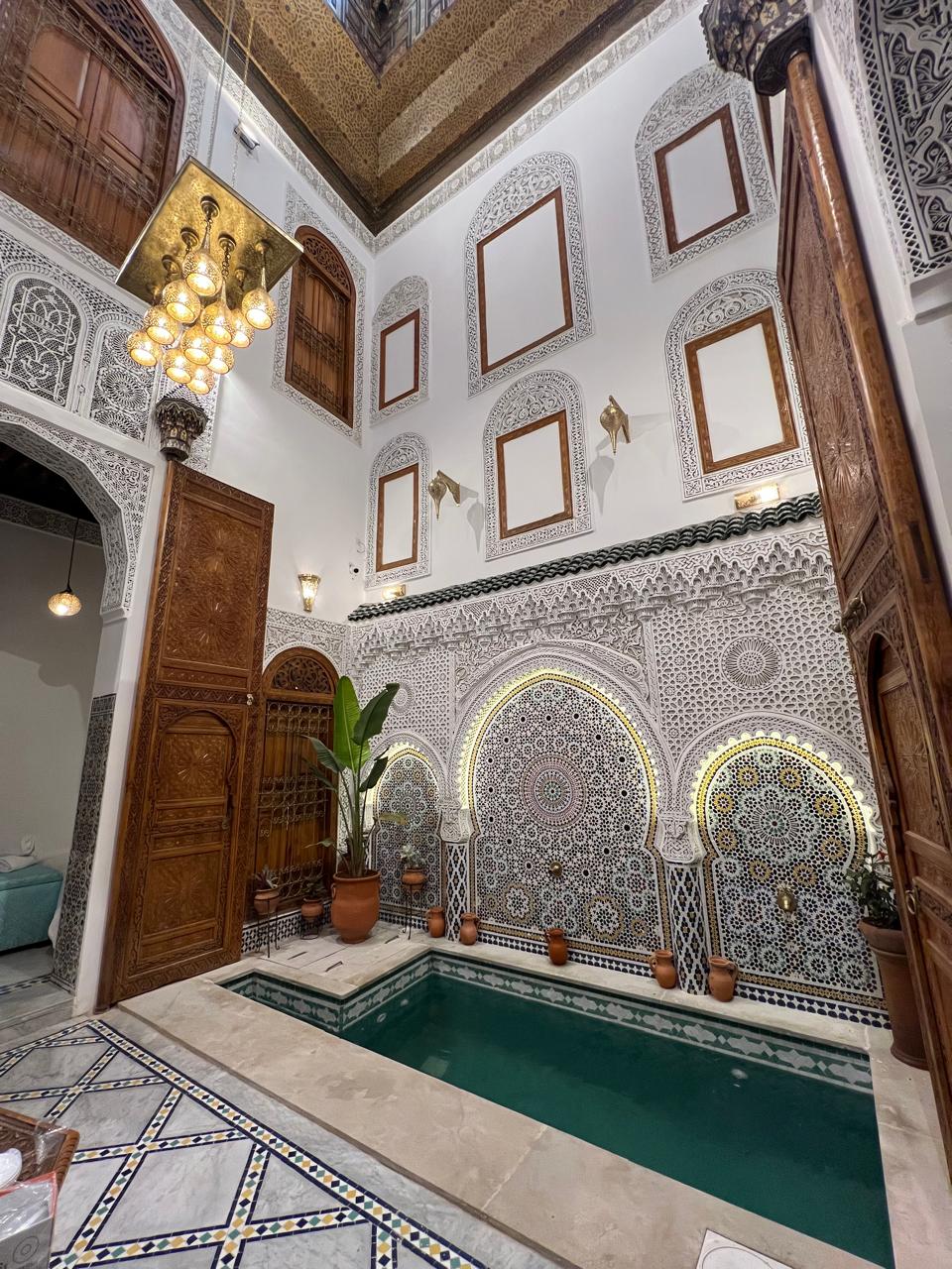 Dar "Le Petit Bijou" is one of the oldest houses in Morocco! This charming cocoon-like house dates from the 14th century and has been entirely renovated for more than 2 years by the best craftsmen of the city with all the noblest materials, such as zellige (handmade tiles), cedar wood, sculpted plaster, tadelakt and wrought iron. The lamps are made of bronze and are totally hand carved, the leather poufs and sofas are from local tanneries.