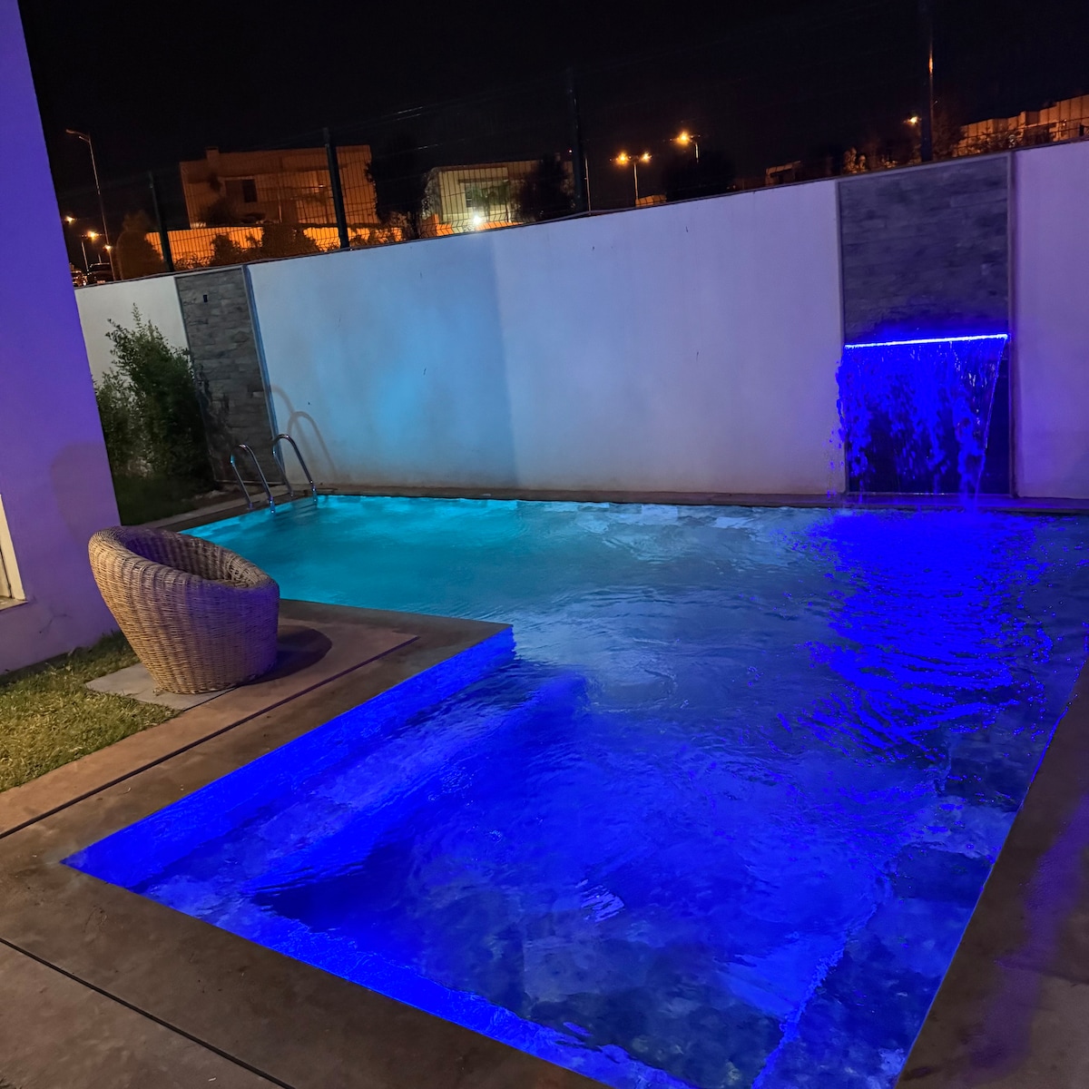 PERLE RARE 😍 POINTS FORTS : •Grande capacité (15 voyageurs) •Magnifique piscine à débordement SANS VIS À VIS •Option Baignoire JACUZZI •Literie de qualité (cf com) •Matériel de sport •Fibre •TV et IPTV dans toutes les suites •6 Climatisation chaud/froid •Proche commodités/ à deux pas de l’Aéroport •Services externes : transfert aéroport, livraison de repas (Glovo), InDrive (Uber) pour se déplacer, Quad •Options : petit déjeuner-succulents plats marocains livrés (cf com)-coursier-ménage