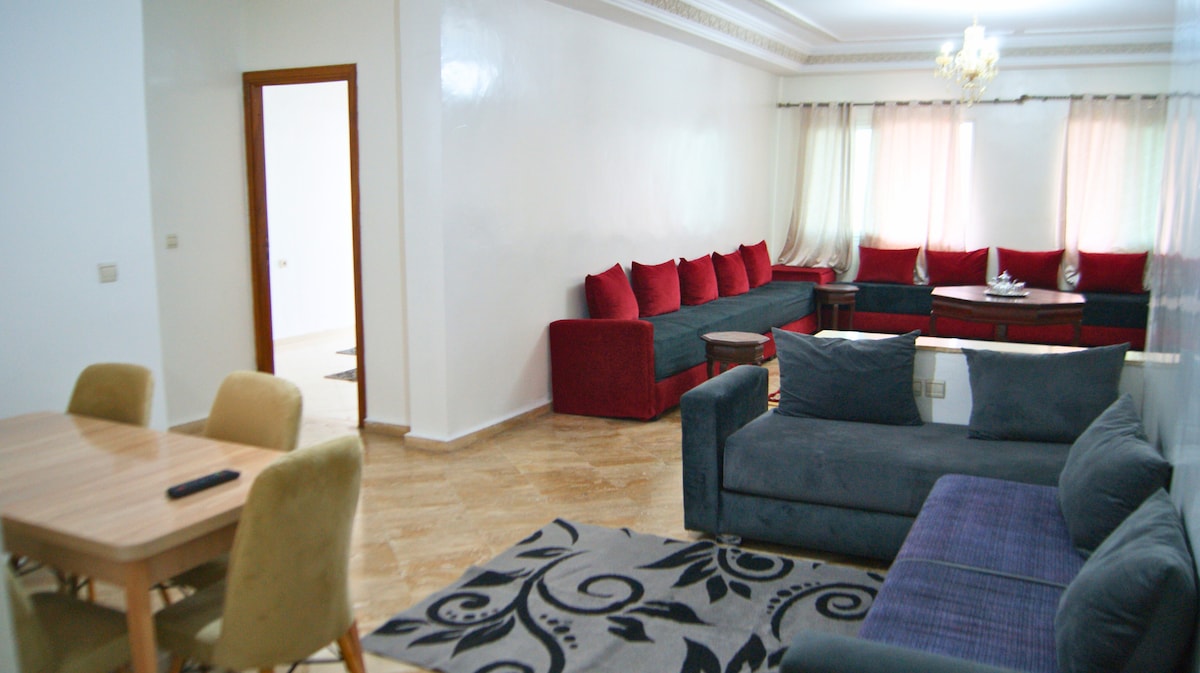 Très bel appartement de 159 m2, situé en plein cœur de Fès, qui se compose de 1 grande pièce à vivre (salon européen avec smart TV, salle à manger et salon traditionnel marocain) Cuisine américaine avec ilot central 2 chambres - 2 lits simples et 2 lits doubles (120cm) 1 Suite parentale avec 1 lit king size, 1 dressing, une salle de bain avec baignoire/jacuzzi, WC et 1 grand balcon 1 salle de bain avec douche à l’italienne et WC WC indépendant WiFI Fibre Air conditionner Parking privé