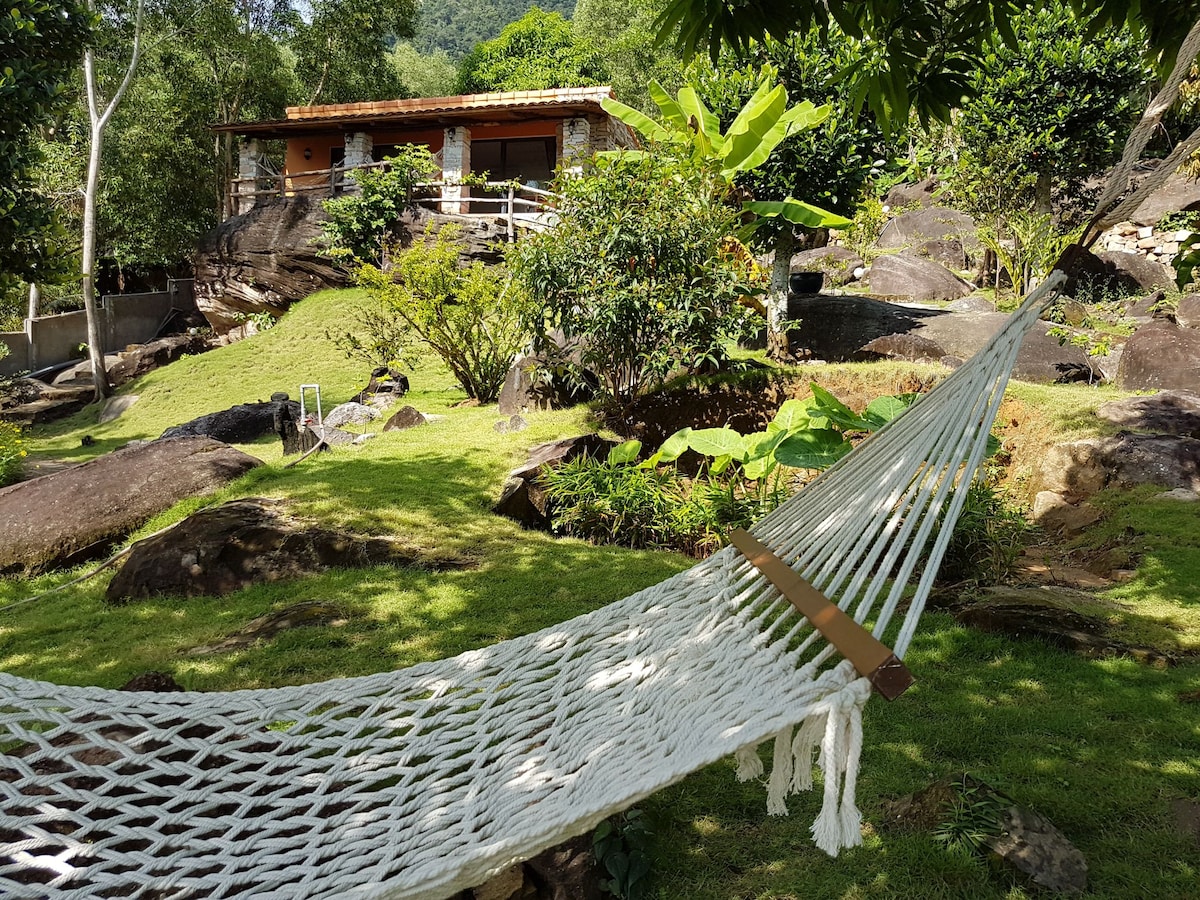 Ngôi nhà xinh xẵn giữa một không gian xanh mát, sinh động với rất nhiều hoa trái. Có rừng nguyên sinh phía sau nhà và có biển trước mặt, cách nhà 300m. Có xưởng gốm vuốt tay để các bạn trải nghiệm và có lò nướng bánh mì men tự nhiên. Tất cả đều do 2 vợ chồng chủ nhà tự làm!