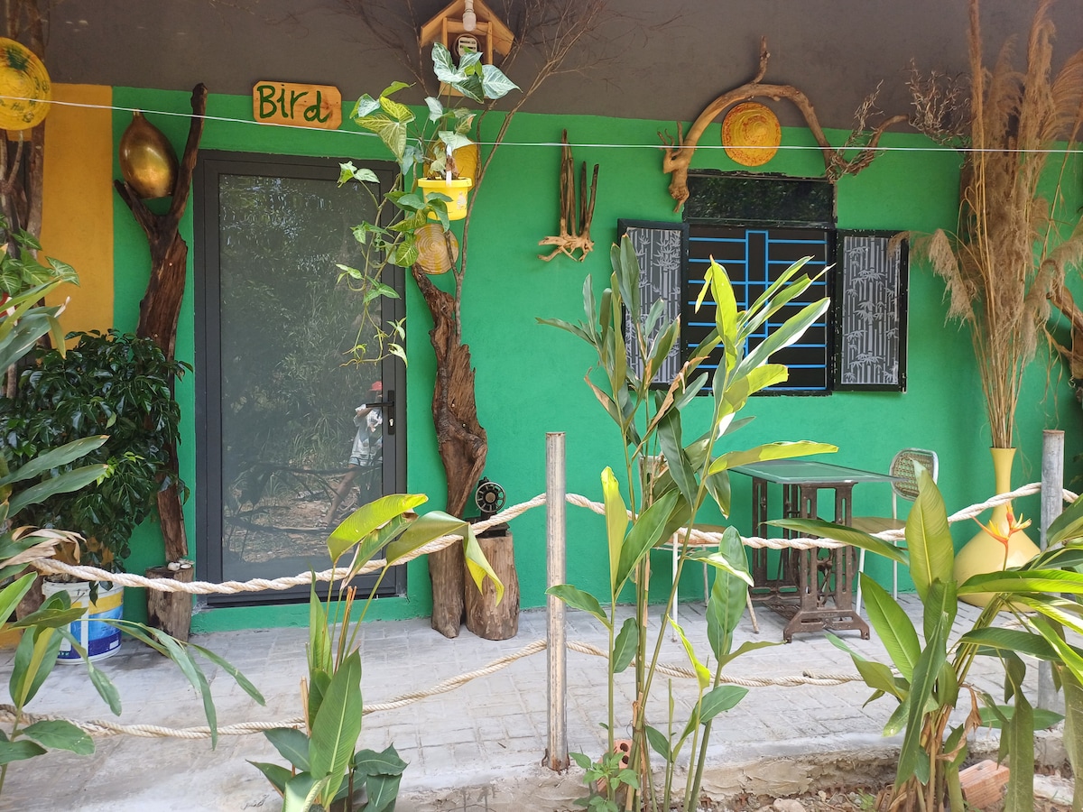 Bird Home is a private room inside a tropical garden villa, offering a quiet and green atmosphere. Each room is uniquely designed like a small piece of art, creating a fresh and inspiring stay. The spacious 45m² room includes a private en-suite bathroom and a cozy working corner, ideal for reading or remote work. Motorbike and bicycle rental are available directly at the villa. Vegetarian-friendly stay Indian guests are welcome Long-term stays are preferred