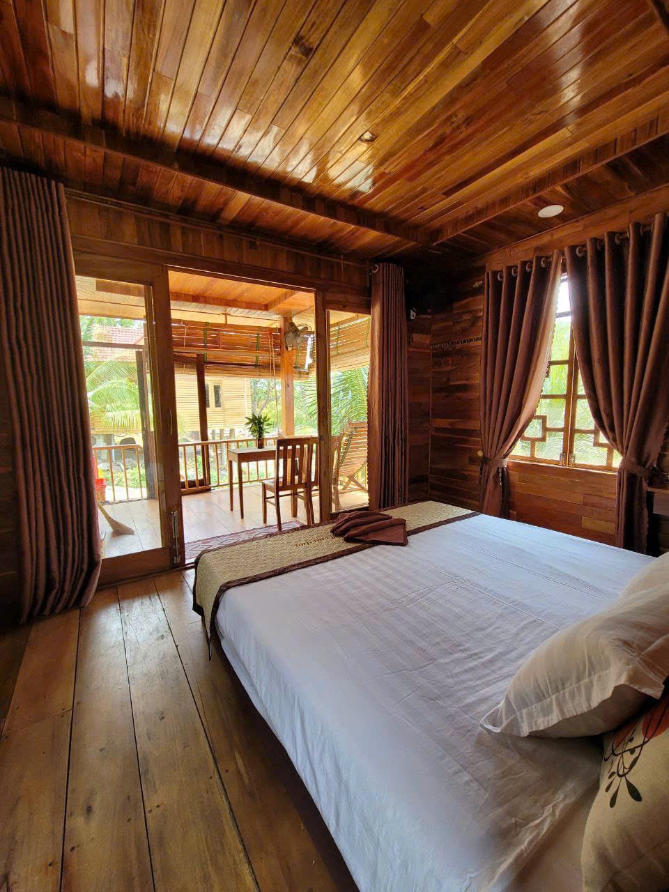 Approximately 12 km from the Phu Quoc International Airport. It is located in the tropical greenery of the mountains along the Ong Lang beach. With beautiful and creative architecture made from bamboo and natural wood. Our room is 24m2 with large windows and balconies. You will be relaxed and immersed by murmuring streams, birds singing from the mountains. The resort serves a daily buffet breakfast and the restaurant offers a wide selection of meals.