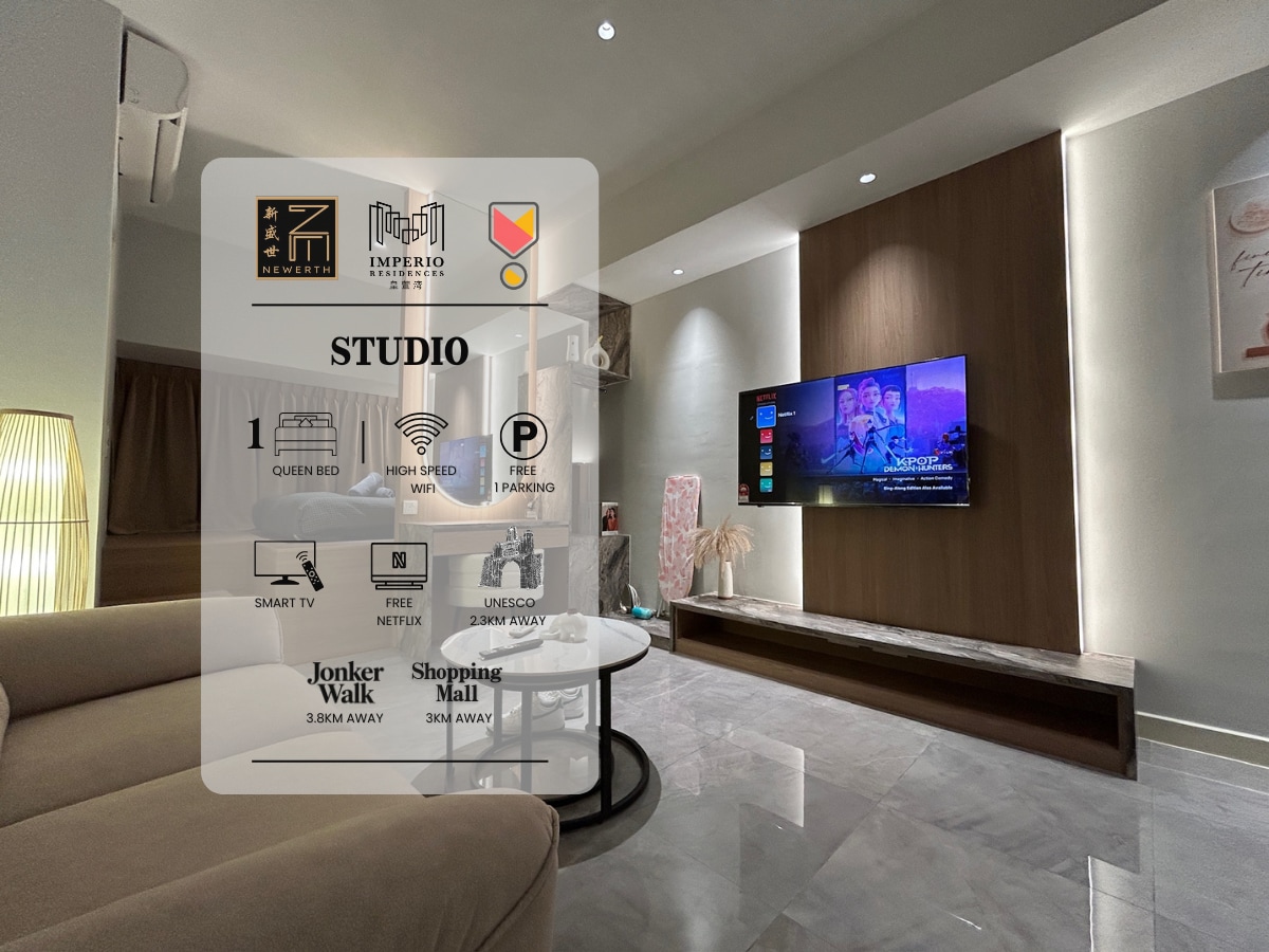 Please read carefully before booking =) This is 1 bedroom apartment located at the heart of Malacca city! ✤ FREE high speed Wifi ✤ Smart TV (NETFLIX+Youtube) It is located at the HIGH floor overseeing city. **Please do expect some road noises as it facing the city. It is located just across the street from shopping malls, eateries and entertainment places. Walk to popular tourism spots like Jonker street , A'Famosa Fort, St Paul's Hill & Church, Stadthuys and Jonker Street in 10-15minutes.