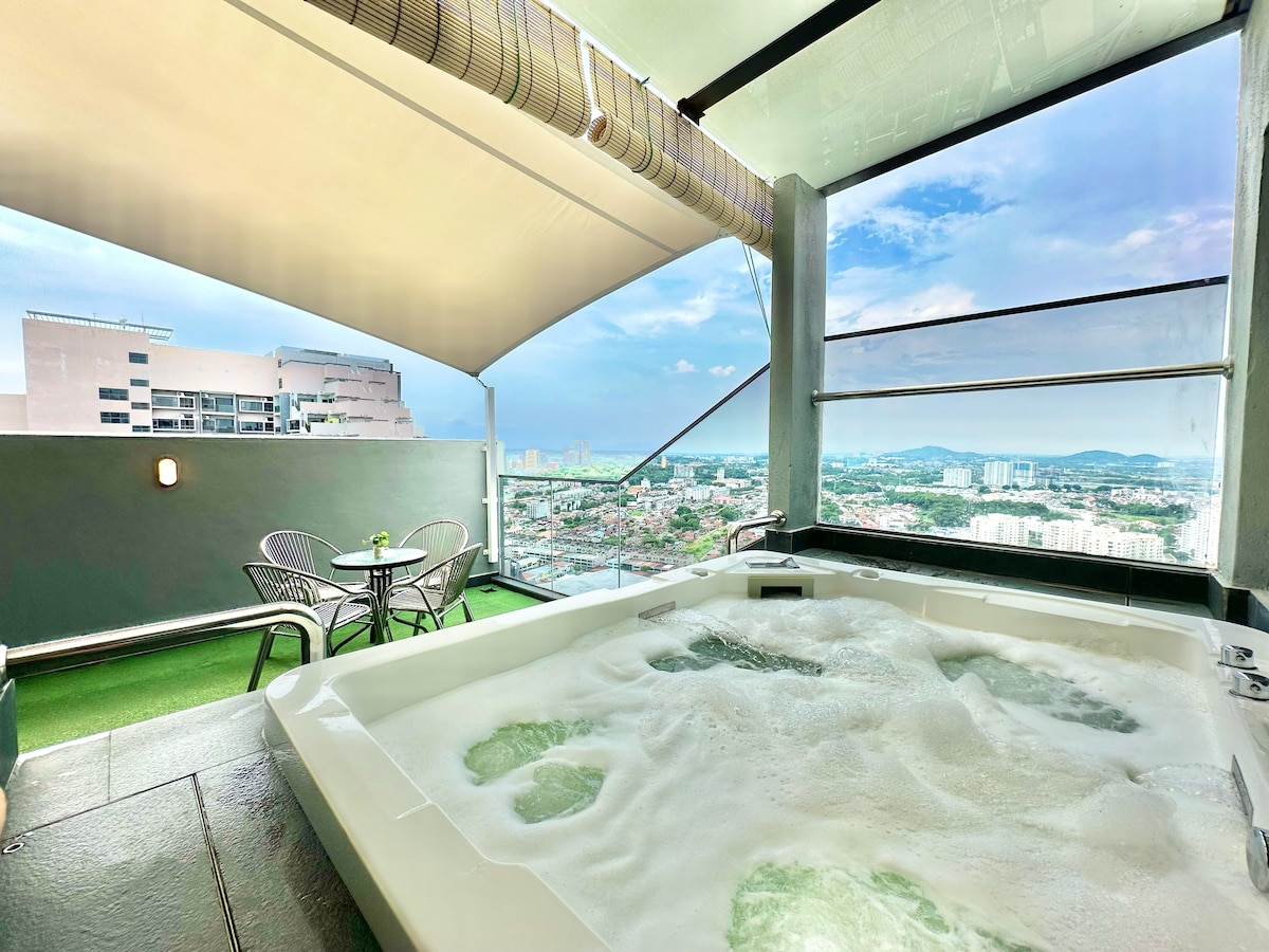 MaxJovial Holiday Management Private Jacuzzi Pool Villa for 3 pax • Premium Design • Full City View Private Jacuzzi Pool • Private Jacuzzi Bubble Pool with Normal Temperature Water Only • 1 Bed Room with Queen Size Bed • 1 Single bed in Living • Balcony with outdoor chair and table • Exceptional Feeling Located in the heart of Melaka near to the tourist attractions and famous restaurants in Melaka . 马六甲开放式家庭式套房(4人住) • 舒适高级的设计 • 附带阳台 • 设备完整 • 客厅以及浴室及私人泳池 坐落在甲市中心,地理位置优越 -旅游景点以及著名美食近
