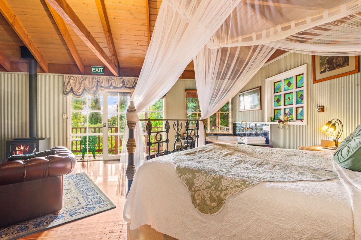 Klara’s Studio is a pet-friendly, luxurious open-plan retreat for couples seeking privacy and romance. It features a slow-combustion fireplace, split heating/cooling, corner spa bath, and large double-glazed windows with tranquil forest views. The studio includes a kitchenette with dishwasher, queen bed, sofa bed, and separate toilet. Step onto your private veranda to relax among the trees and enjoy the peaceful sounds of nature.