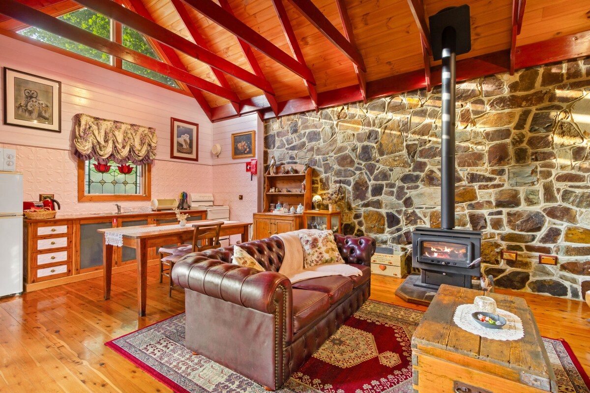 One of the earlier homes built in the Ranges, this unique century old Mountain Ash Log Cabin has been extended and updated over the years to create an enchanting haven to call home whether it’s for a night, a weekend or forever. One of the three remaining log cabins built by pioneer Jack Dodd (another being Kelly’s Hotel in Mt Dandenong). Often, you’ll be above the clouds or among them adding to the cathartic ambience. The romantic log-lined lounge hosts a cozy wood fire with a glass of love.