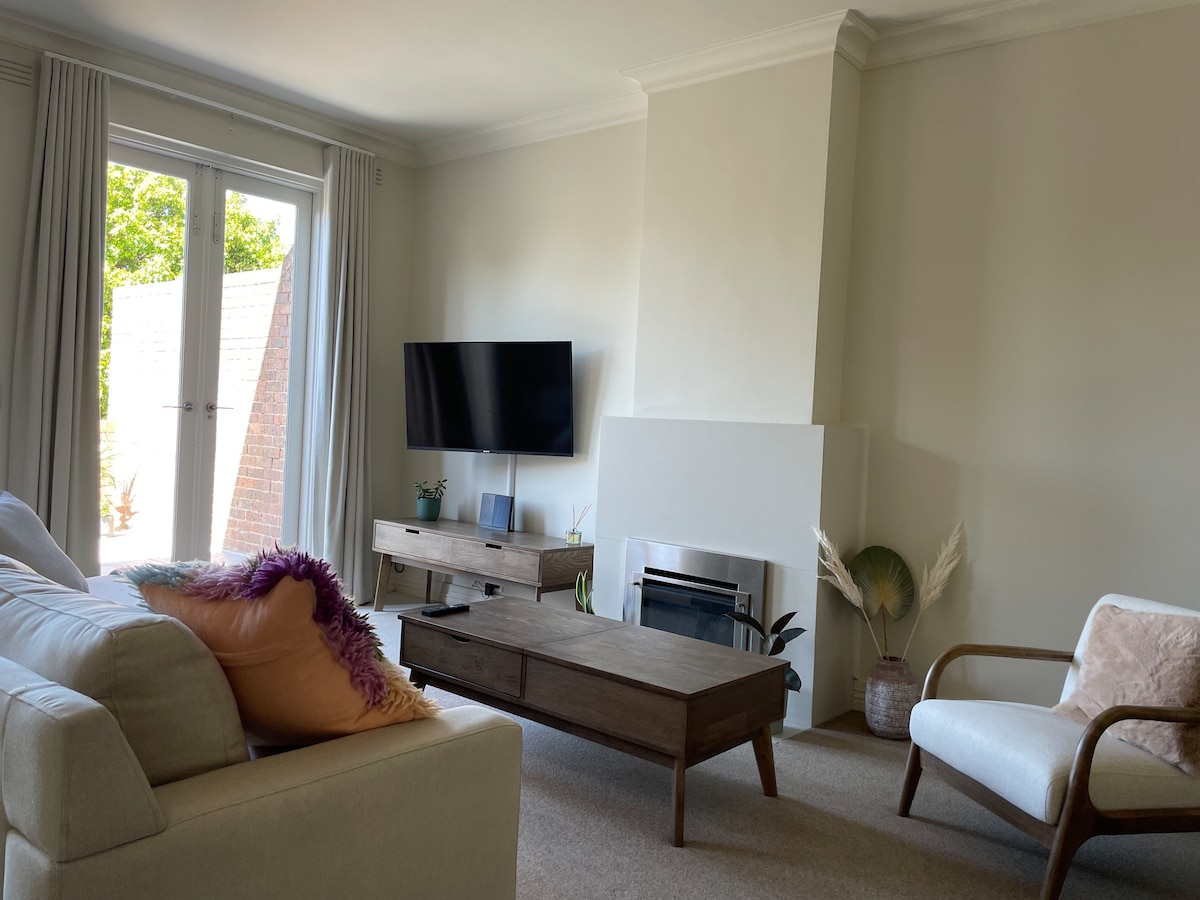 Fountain Villa is a modern villa with beautiful outdoor spaces. Enjoy a modern spacious kitchen and a light filled living area with two roomy bedrooms. Relax in the private, peaceful courtyard in front of the firepit. For an outdoor experience, cook on the webber. A very short convenient walk to public transport (tram and train) which take you straight to the doorstep of the MCG, Rod Laver Arena and the city. Linen for the second queen bed is an extra charge of $30.