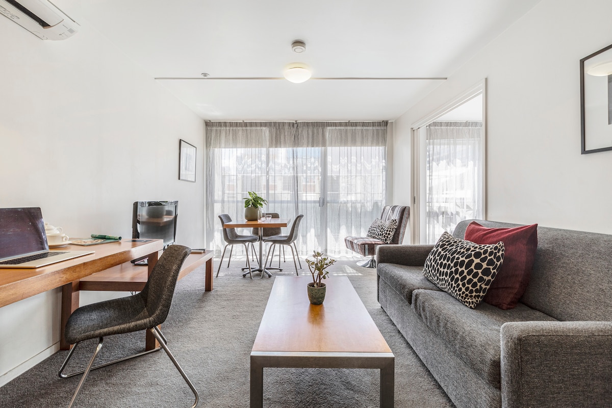 Our stunning serviced Studio Apartments provide a stylish, open-plan space to unwind and relax. Offering a comfortable queen bed with custom linen, apartment-controlled heating/air conditioning, fully equipped kitchen with coffee machine. Full bathroom with amenities and hair dryer, LCD TV with Netflix connectivity and WIFI. A wardrobe, ironing board and iron, and private safe add to the convenience. Guests have full access the rooftop Infinity Pool and Gym. Daily Servicing excluding weekends.