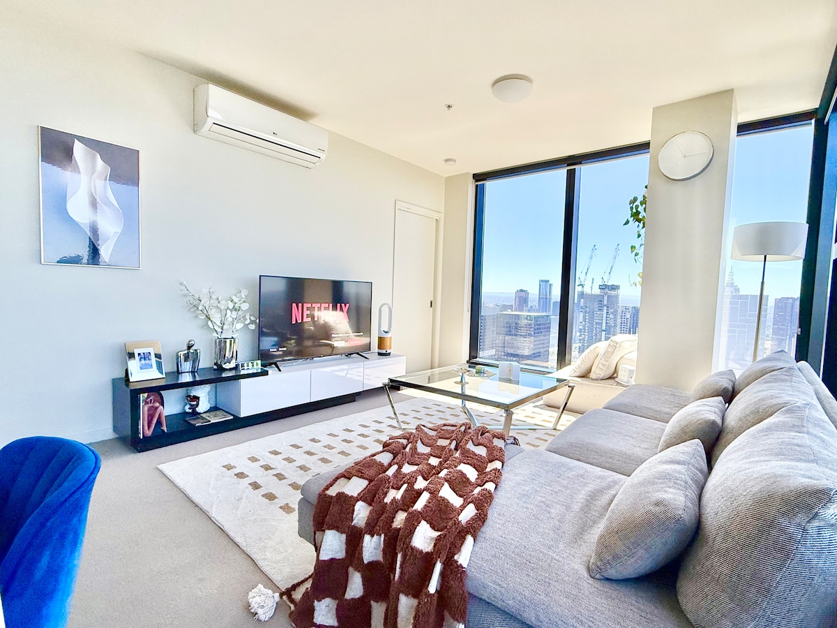 Situated on the top floor of one of Melbourne's best apartment complex's, this well designed apartment has uninterrupted panoramic views spanning from the ocean to the beautiful Docklands. With floor-to-ceiling windows in the bedroom, you'll be waking up to one of Melbourne's best views. Situated in a convenient location, this apartment is a 3 minute walking distance to Melbourne's main train station, Southern Cross Station, along with retail services and grocery shopping needs.