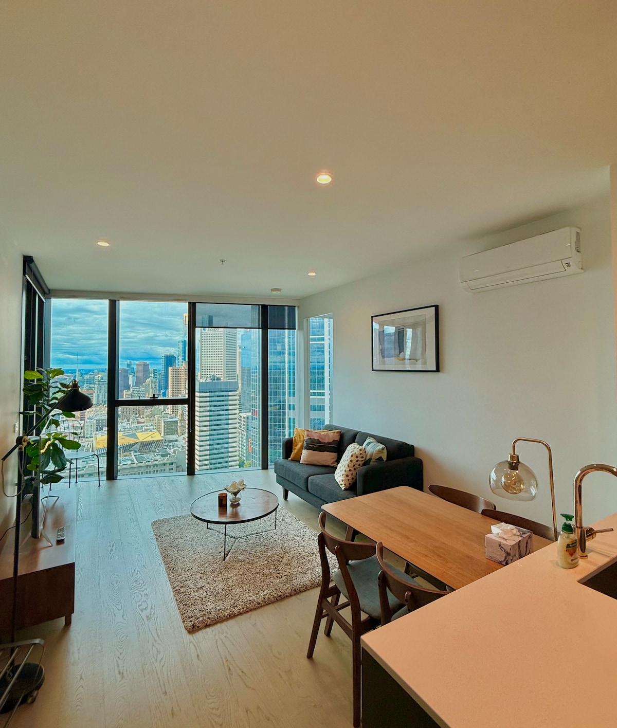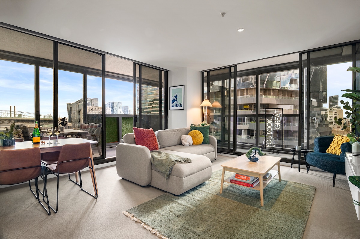 Step into your warm and stylish city pad, positioned on the corner of Melbourne’s buzzing CBD. From Marvel Stadium over Southern Cross Station to the lights of Lonsdale Street, the sweeping views create a true city backdrop. Inside, colourful art, cosy furnishings, and thoughtful details make it feel like home, not a hotel. Sip wine on the balcony, cook family meals in the fully equipped kitchen, or relax on the sofa with streaming after a day exploring nearby shopping, dining and events.