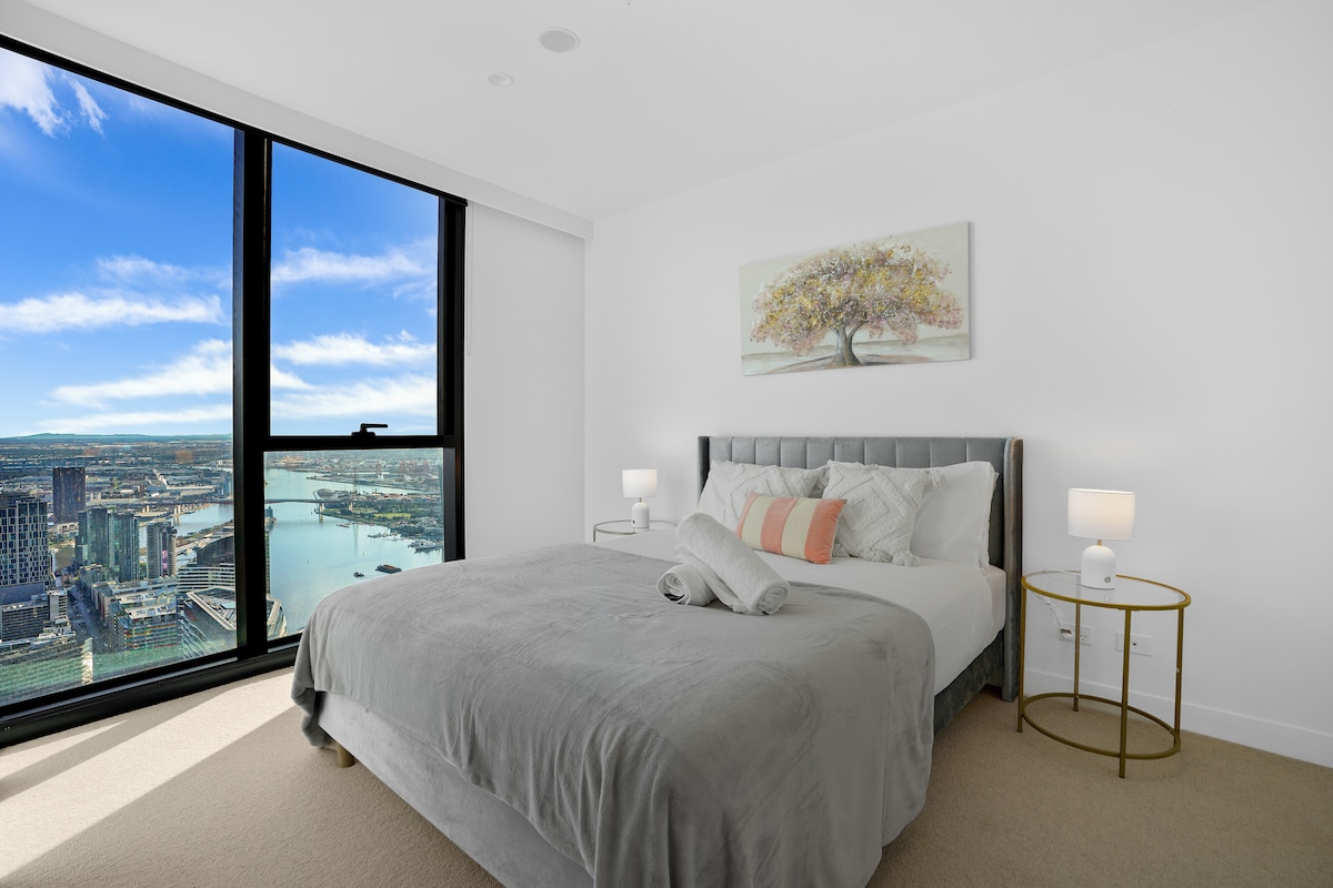Enjoy your stay at Queens Place – 76th Floor luxury 3 Bedrooms apartment in the heart of Melbourne CBD! The apartment is located on the sub-penthouse floor. This elegant and spacious three-bedroom suite offers breathtaking panoramic views. You may even spot hot air balloons in the living room and bedrooms! - In the Free Tram Zone - Woolworths supermarket on the ground floor - Steps away from the famous Queen Victoria Market also many Restaurants, Pubs, Cafes and Shopping Malls.