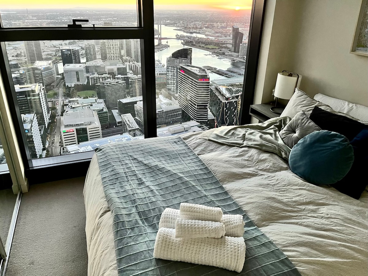 Enjoy a clean, relaxed experience at this centrally located place. Try the top floor! In Melbourne CBD this place really stands out. Phenomenal sunsets! Unencumbered views to the bay, rivers, Docklands, WestGate & Bolte Bridges, distant hills, city lights. Convenient. Walk to Crown, ConventionC, Marvel Stadium, Southern Cross Station, il Mercato Centrale. Great amenities: Pool/spa/sauna/gym. 1x Quality queen bed + Quality 2x sofa beds, linen, Hot shower, Kitchen, Ergonomic Desk, AppleTV