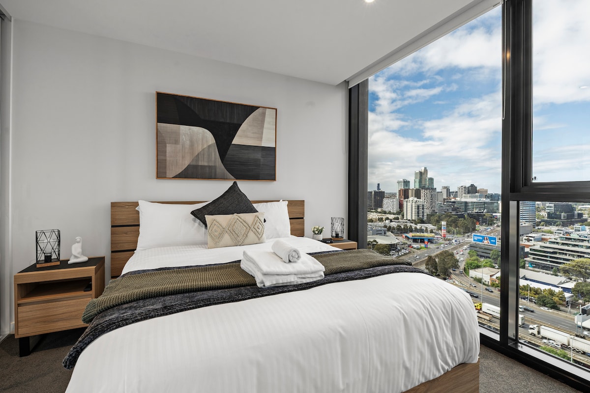 Enjoy a stylish, relaxed experience at this centrally located place. Try the top floor! In Melbourne CBD this place really stands out. Enjoy unencumbered views: the bay, river, Docklands, WestGate & Bolte Bridges, distant hills, city lights, phenomenal sunsets. Convenient. Walk to Crown, MConventionC, Marvel Stadium, Southern Cross Station, il Mercato Centrale. Great amenities. Pool/spa/sauna/gym. 1x quality queen bed + sofa 2x beds, linen, Hot shower, Kitchen, Ergonomic Desk, AppleTV.
