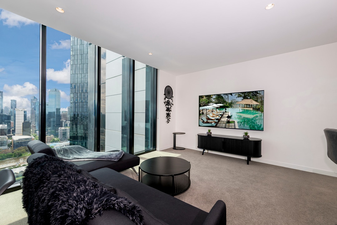 Overlooking Yarra River and Melbourne Exhibition and Convention Centre, this spacious two-bedroom, two-bathroom apartment provides stunning views of Melbourne. A fully equipped kitchen, formal dining area and comfortable lounge, provides the ultimate comfort for your Melbourne stay. Located close to Crown, South Melbourne Market and much more. With trams located at the doorstep, easy access to restaurants, theatres and all of Melbourne's iconic sporting arenas is easy.