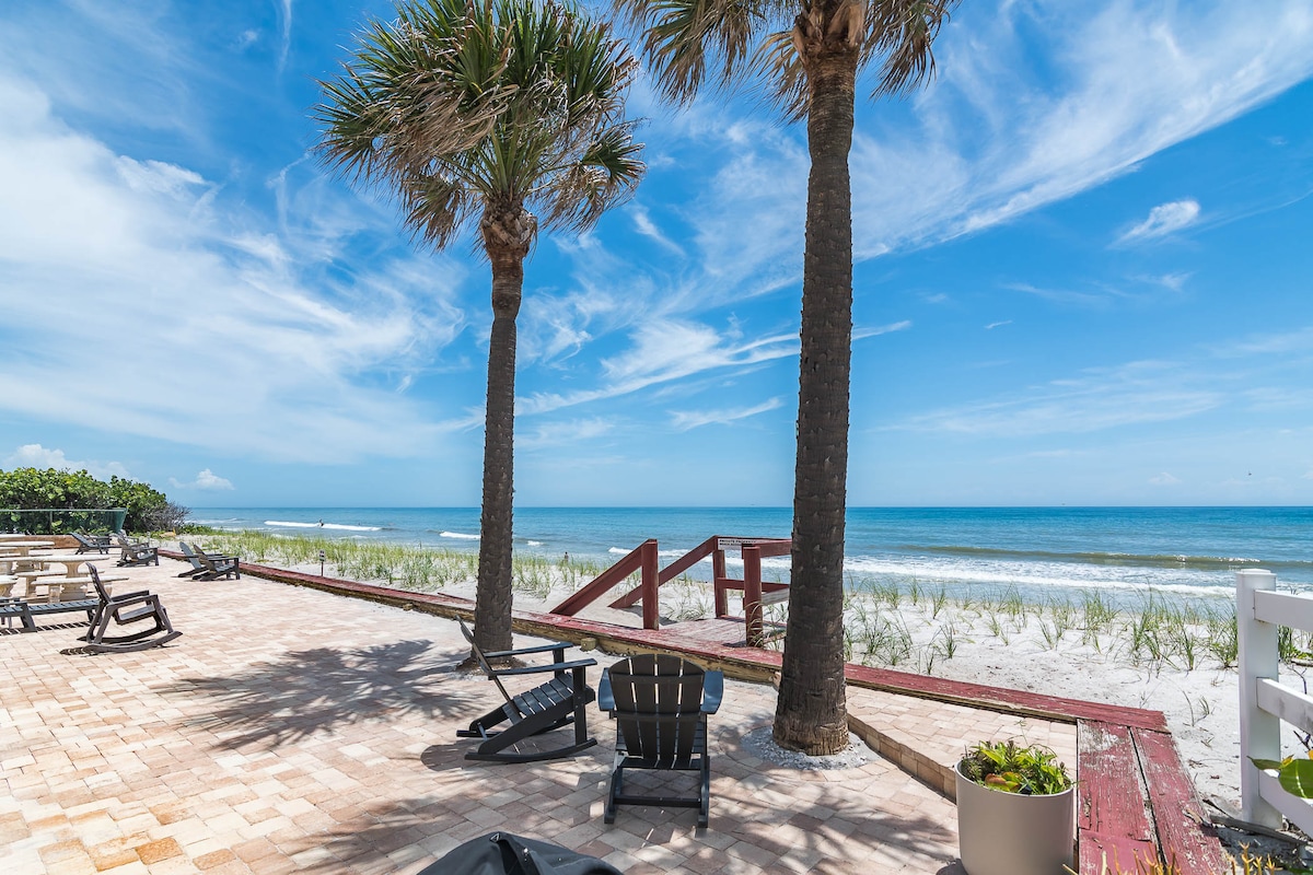 Steps from the sand! Upscale and spacious 1 bedroom, 1 bath suite. Breathtaking ocean views from every angle including triple glass slider, balcony, and oversized bedroom windows! See and feel rocket launches from the private balcony. Perfect for aquatic adventurers or close-knit friends. Tastefully appointed and newly renovated, expect an idyllic location for on-the-water fun with luxury for up to 4 guests Near Disney/Orlando Airport, Kennedy Space Center, Port Canaveral, Cocoa,Melbourne
