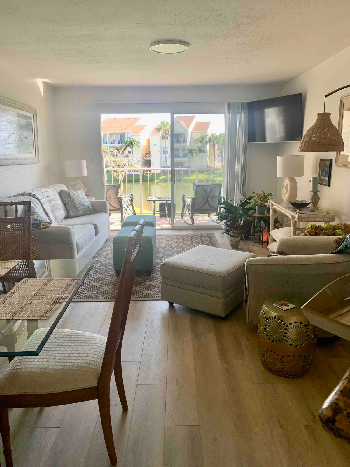 This laid-back getaway in Indialantic Beach is just a 5 min stroll to the beach. Enjoy morning coffee or evening wine on the balcony overlooking the peaceful pond and pool - one of the best views in the complex! Featuring vaulted ceilings with fans, 2 TVs with cable and wifi, fully stocked kitchen, and beach amenities. Guests have access to the heated pool, hot tub, fitness and laundry rooms, free parking. Please note - condo is on 3rd floor with no elevator, but the view is worth it!