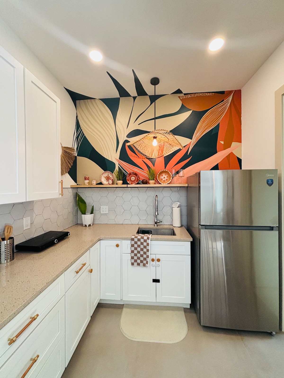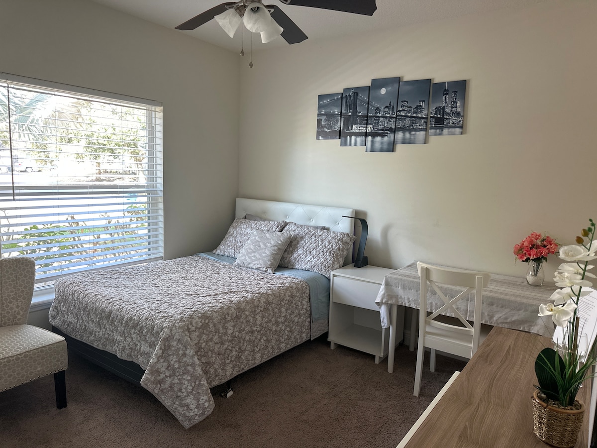 THERE IS A PRIVATE ENTRANCE COZY SUITE. ALL FOR YOU... . THE SUITE HAS A NICE big chair to RELAX...Your family will be close to everything when you stay at this centrally-located place. You can walk 🚶♂️ at any time in our safe neighborhood...the space is large comfortable very private ..Everything is new ; the bed is a KING STEARN & FOSTER MATRESS ; a large patio all for you , with a BBQ grill & Utensils , a Conue for two , 2 bikes and over looking at tropical trees & birds 🐦..