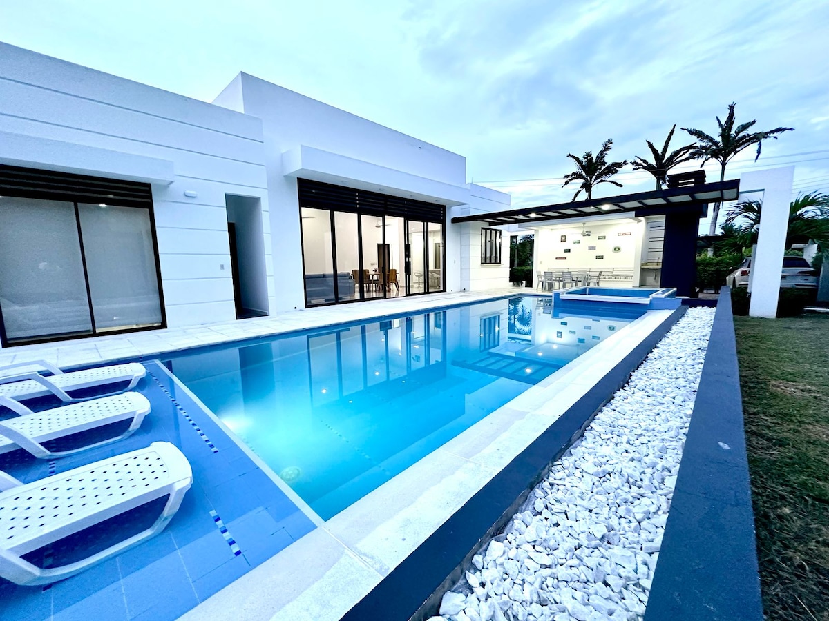 Casa de descanso, moderna, dotada con todo lo necesario para días, semanas o meses de descanso y salir de la rutina, juegos de mesa, wifi en toda la casa, tv por cable, cajilla de seguridad. Cuenta con incomparables zonas húmedas privadas piscina, jacuzzi, bar húmedo, cascada y chorros indirectos, BBQ, parqueadero con protección solar para 3 vehículos, cuatro habitaciones con aire acondicionado, estar de tv, lavadora, calentador de agua. NO RECIBIMOS MASCOTAS DE NINGUN TAMAÑO, RAZA O ESPECIE.