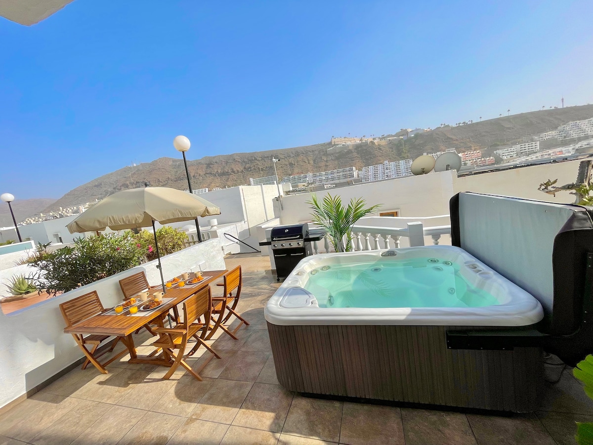 Spectacular two-bedroom semi-detached house just 100 meters from the Meloneras beach, golf course and leisure shopping center. With independent entrance from the street and easy parking. With air conditioning, wifi, garden, jacuzzi and barbecue exclusive to the accommodation. Located in a very quiet complex, with a spectacular pool and playground.
