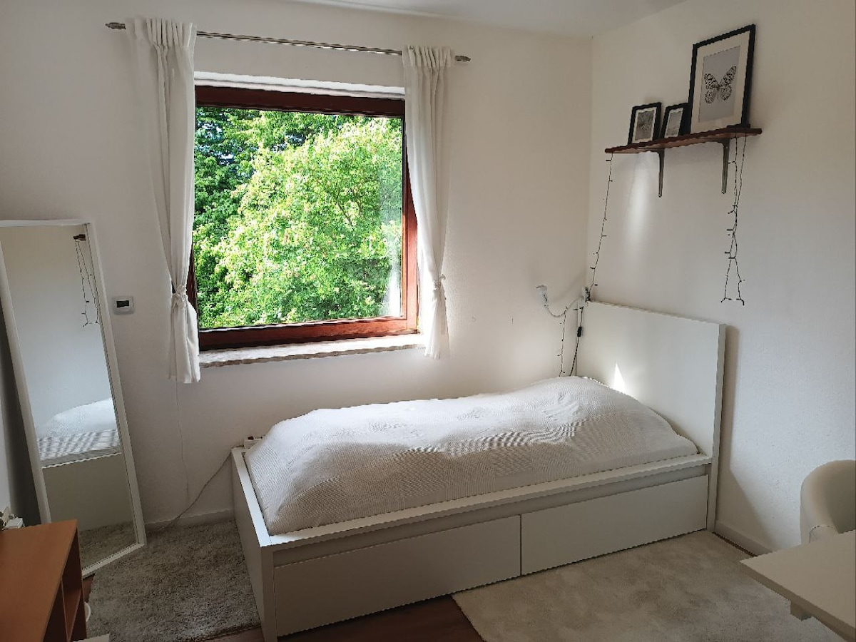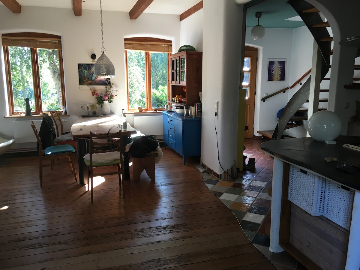Moin! Wir bieten unsere Anliegerwohnung als Privatunterkunft zur Vermietung an. Sie hat einen eigenen Eingang, Küche, Duschbad und Wohn- / Schlafzimmer. Sie ist über eine Innentreppe mit unserem Haus verbunden. Oben ist aber eine Tür welche verschlossen ist. Die Unterkunft hat einen separaten Eingang, wir ermöglichen dir eine zeitlich flexible Schlüsselübergabe. Handtücher, Bettwäsche, WLAN, Wasserkocher, Geschirrspüler, Kamin und Terrasse vorhanden. Kostenloser Parkplatz auf dem Grundstück.