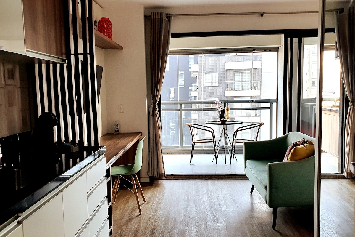 Stylish 50 m² apt. located at Bela Vista, has 24hr doorman. 2 bedrooms (only 1 with AC, and queen bed, the second one is quite small and can be used as an office, fitting a double-sized sofa-bed) and 1 bathroom. With amazing views from every window, it is a great place to work and relax. The private jet-tube at the balcony is a fantastic spot to enjoy the city views. Ideal for couples, professionals or small families looking for comfort, convenience, and one of the best views in the city.