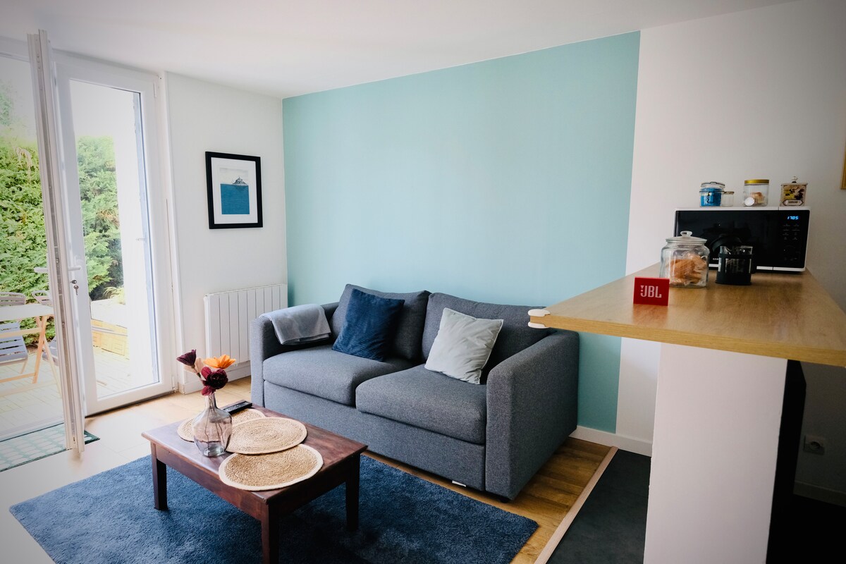 Dans le coeur historique de Caen, à coté de la mairie et de l'abbaye aux hommes, appartement ancien entierement renové de 65m2, RDC lumineux sur cour et jardin, comprenant une cuisine ouverte entièrement équipée, salon avec canapé convertible, chambre lit double, salle de bain avec douche et baignoire. Une terrasse plein sud avec vue sur un jardin clos et ensoleillé, parking possible dans la cour. Télévision, wifi, table et fer à repasser, sèche cheveux, linge de toilette et de lit fourni.