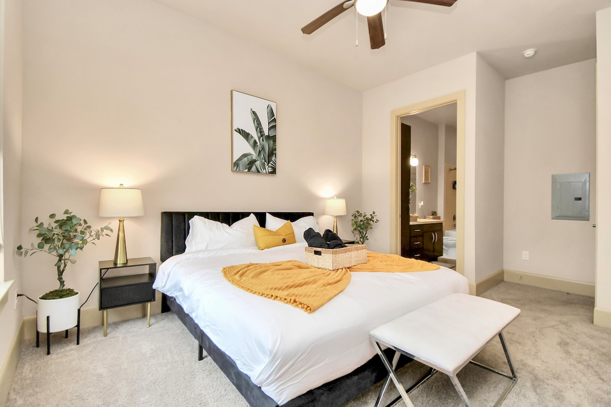 舒适的2卧室,配备加大双人床,带免费停车位、游泳池,位于休斯顿市中心