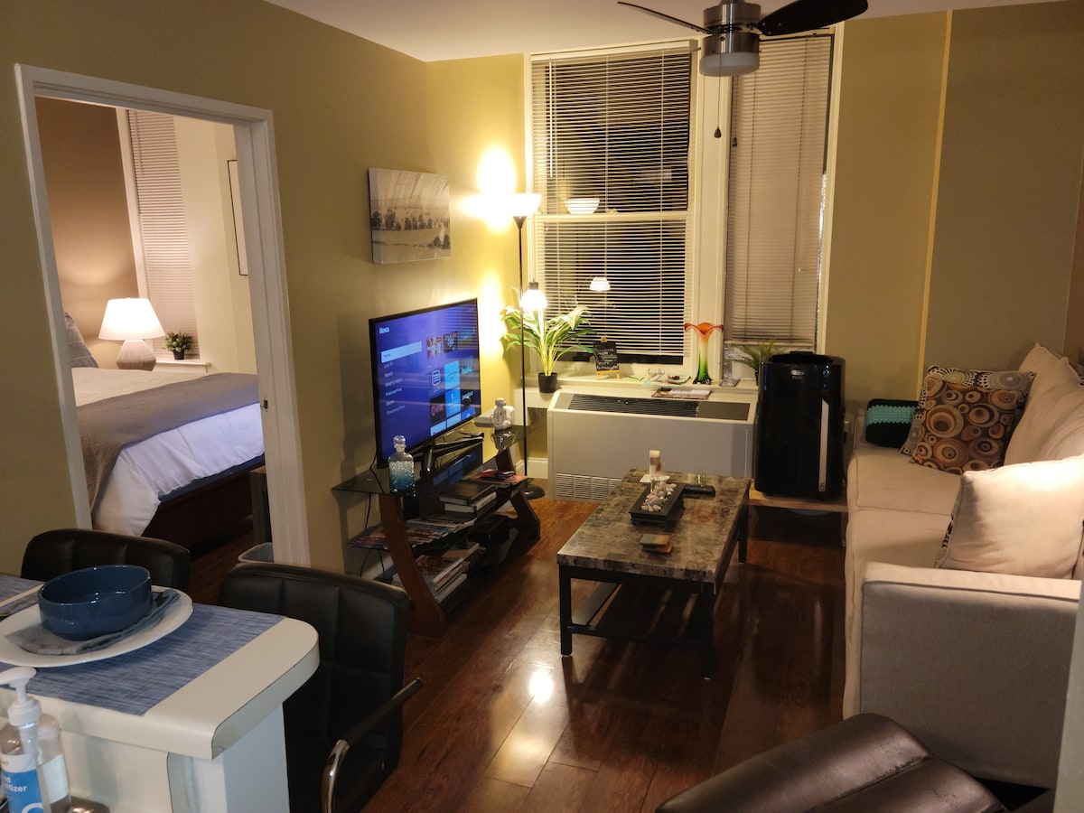 Welcome to your home away from home in a historic downtown high-rise! Right outside the building is Court Square park w Victorian water fountain and trollies on Main Street. There's a Walgreens and several small convenient stores to help stock your fridge if you do choose to make use of the full kitchen, but of course you must try Rendezvous BBQ before you leave! There is a coin laundry on-site and also FREE use of an off site gym.