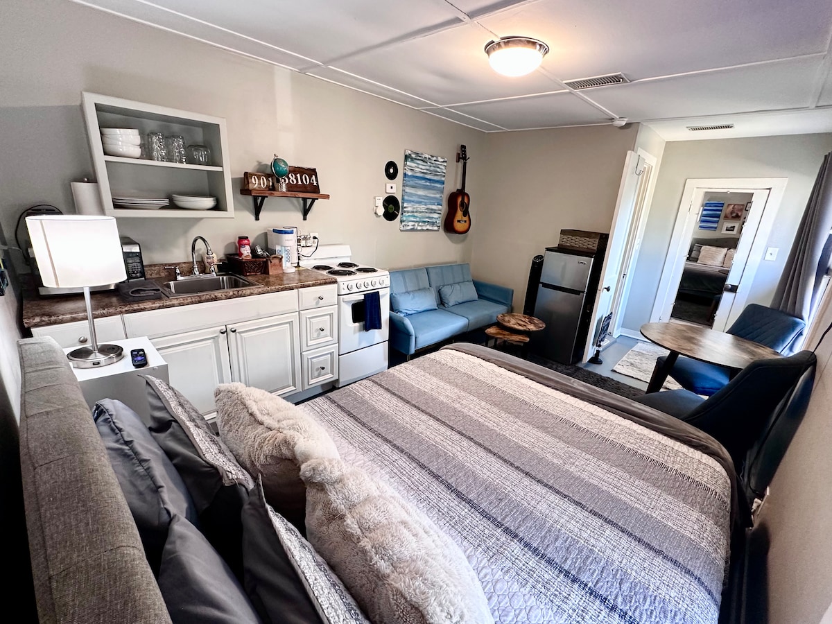 Enjoy a charming, 100-year-old detached guest home with 522 sq ft of space! Perfect for couples or solo travelers, this pet-friendly retreat is just steps away from the vibrant Crosstown Concourse! Features a fully equipped eat-in kitchen, a stocked coffee bar, a renovated bathroom, fast WiFi, and off-street private parking. The main space is studio-style with a queen bed and Roku-equipped television. Hosted by local Memphian!