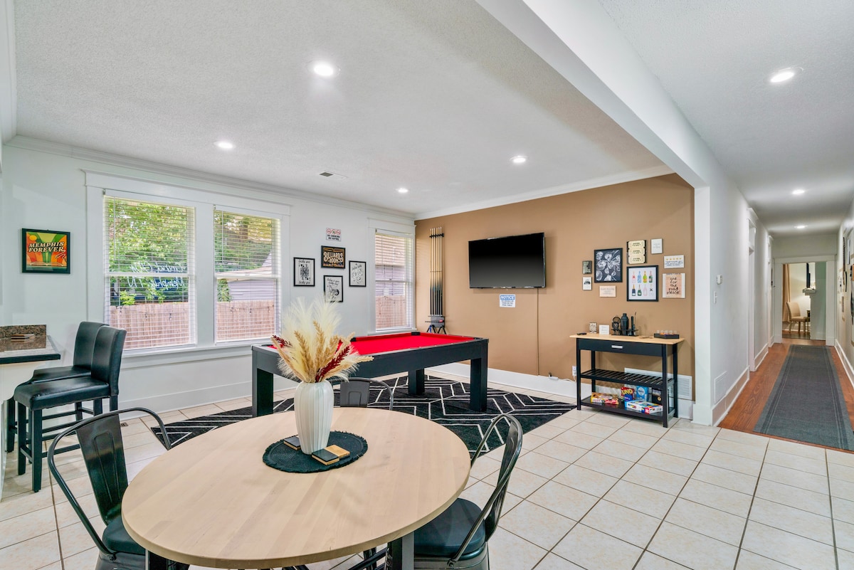 Spacious 3300 sqft home. Great for large groups!! Walk to Cooper Young entertainment district (1 block) Walk to Liberty Stadium 10-15 Minutes to Beale, FedEx Forum, Downtown, Graceland 2 Car Garage, Large fenced yard pet friendly Mural Wall for photos 2 Primary Suites with King Beds 5 bedrooms total 3 Full Bathrooms & large half bath Dining Room Table seats 10 with 2 at Bar Kids Ping Pong Table & Air Hockey & Arcade Basketball Local rentals need prior approval -contact us through “Contact Host”