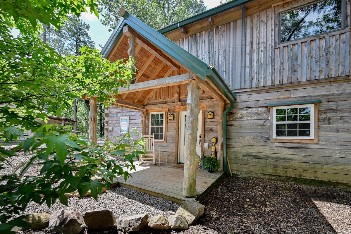 For the Wild at Heart Who Crave Comfort — Just minutes from Wolf Pen Gap ATV trails, Evergreen Dreams pairs Ouachita Mountain adventure with spa-level luxury. Spend the day hiking, riding, or chasing waterfalls, then return to a cedar hot tub under the stars, an infrared sauna, outdoor shower, soaking tub, and triple-head walk-in shower. Inside, enjoy Casper Dream mattresses, buttery-soft linens, and a forest-green Joybird sofa.