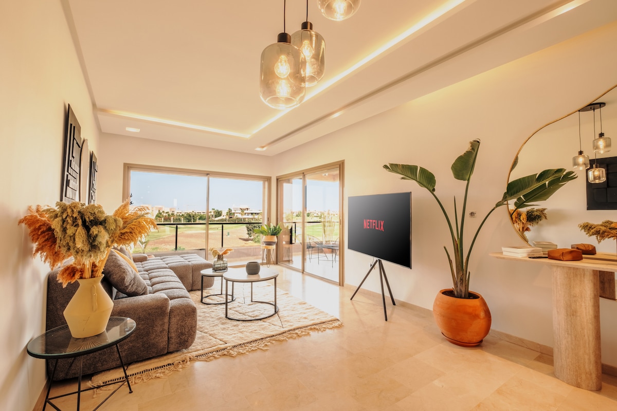 Appartement sobre, minimaliste et élégant, décoré par l’artiste NICH, situé en plein golf Prestigia. 3 chambres, 2 sdb, grand salon, double terrasse avec salon exterieur, Smart TV, Netflix, fibre. Résidence sécurisée avec piscine et parking. Serviettes, shampoing, gel douche fournis. Femme de ménage dispo (sur demande). À 3 min du restaurant et bar Montgommery, a 10 min en voiture de l’aéroport, Menara Mall, Hivernage, Mazar, et 15 min de la Médina/Guéliz. Calme, vue sublime et confort.