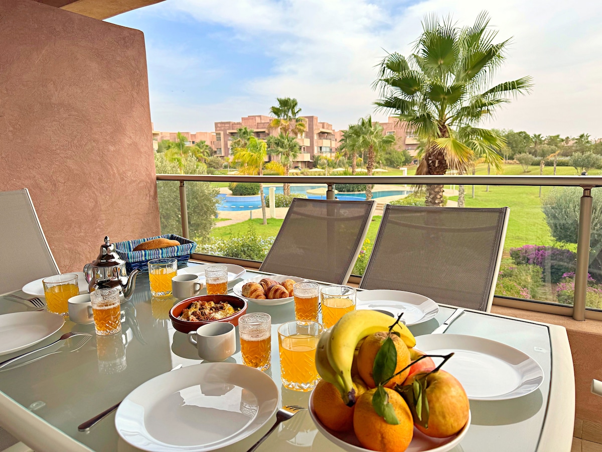 The Prestigia apartment is now part of the Holidays Family group. Treat yourself to a memorable getaway and discover a peaceful and luxurious retreat nestled in the vibrant heart of Marrakech. The apartment welcomes you into a haven of tranquility where every detail invites relaxation. Its refined decor, warm colours, and delicate fabrics create a unique and elegant atmosphere. The apartment is ideally located at the heart of a golf course, with a private garden and stunning views of the pool.