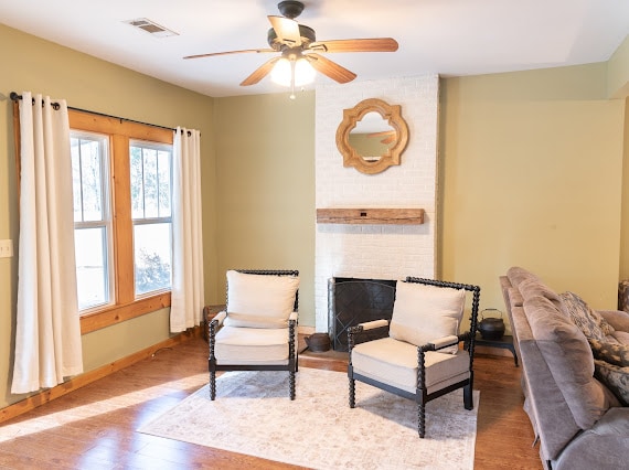 The Cottage is very cozy with a mixture of vintage and industrial decor. Visitors will have complete privacy within the house at all times, but with our home close by, we are always happy to help should you need anything! We are located in Downton Brandon in the Historic District. The Cottage is a guest house seated behind our home; it is a very quiet place, and it is great for working individuals, couples seeking a fun concert experience, or families participating in ball tournaments.