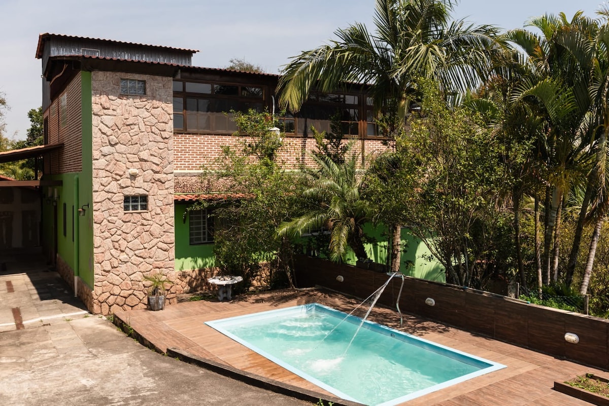 Em contato com a natureza, nosso espaço é bom para crianças, famílias e grandes grupos. O sítio tem 36.000 metros de natureza, com campo de futebol, de vôlei, pula-pula, futmesa, piscina, totó, ping-pong, cavalos, lago, pescaria, galinheiro, cabra, pavão… Possuimos 5 suítes + 2 quartos. Cozinha bem equipada. Área gourmet com churrasqueira, forno à lenha, vestiário, sauna e hidromassagem. Estacionamento, Wi-Fi , ar condicionado,TV smart. Gerador caso haja falta de luz