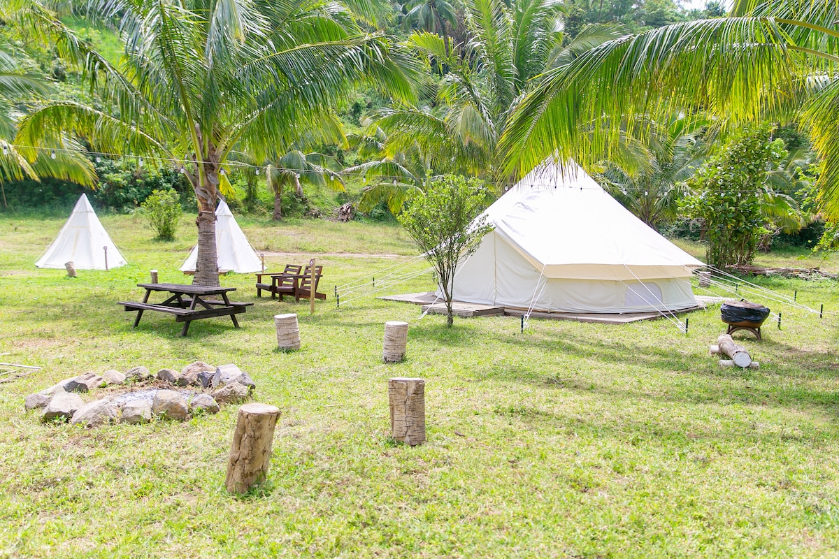 Our spacious glamping tent is one of 4 glamping tents that can accommodate 4 guests (or up to 6 upon request with additional charges). The tent sits on an expansive 12ha property with activities such as hot baths, giant swings, nature hikes, horseback rides, mountain biking, and more! Calaia Nature Park features an organic farm, camping area, and nature reserve. It is the perfect venue to slow down, enjoy the outdoors, and celebrate your milestones!