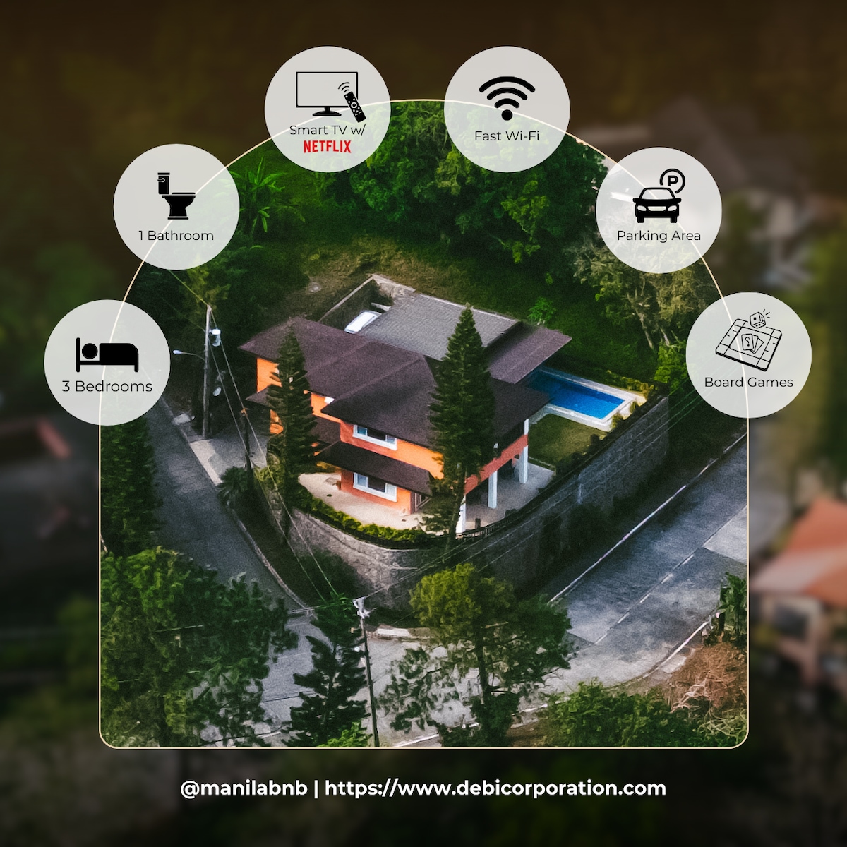 Spacious, stylish, 1,000sqm resort-like home in Tagaytay w/ amenities like swimming pool, basketball court, cinema room, game room & videoke. Ideal for wedding preps, birthdays or a relaxing staycation. Picture having an exclusive clubhouse-like space for your group throughout your stay. Parking for 8-10 cars, perfect for big groups. Our on-site staff is ready to assist, NO ADDITIONAL COST. The property is fully gated, enclosed by a private perimeter fence with CCTV cameras around the exterior.