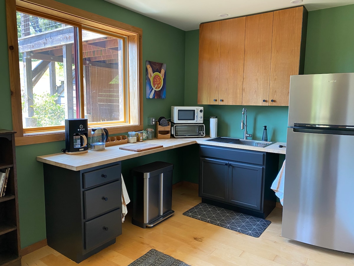 Stay on the Mendocino Coast in this downstairs oceanfront studio with direct access to Virgin Creek Beach and the Haul Road Trail. The studio features a comfortable queen bed, private bath, dining area, and a full kitchen with everything you need. Large windows showcase ocean views and natural light. Walk or bike into downtown Fort Bragg, visit Glass Beach and MacKerricher State Park, or watch sunsets and whales from the trail.