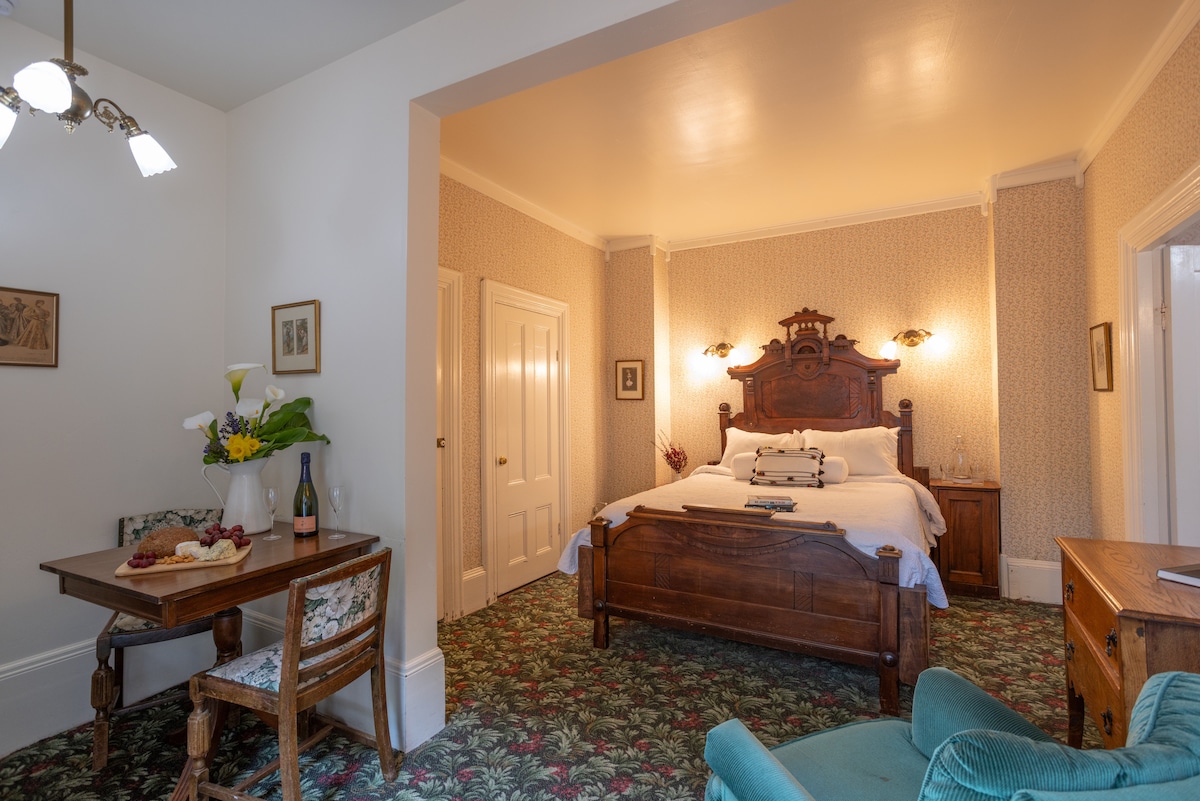 The cozy Creekside Room at Dennen’s Victorian Farmhouse is a guest favorite. It features a queen size bed, a large wood-burning fireplace with duraflame logs provided, and a panoramic view of the property. This is a pet friendly room. Enjoy complimentary access to our communal tea room, which offers a curated selection of local teas.