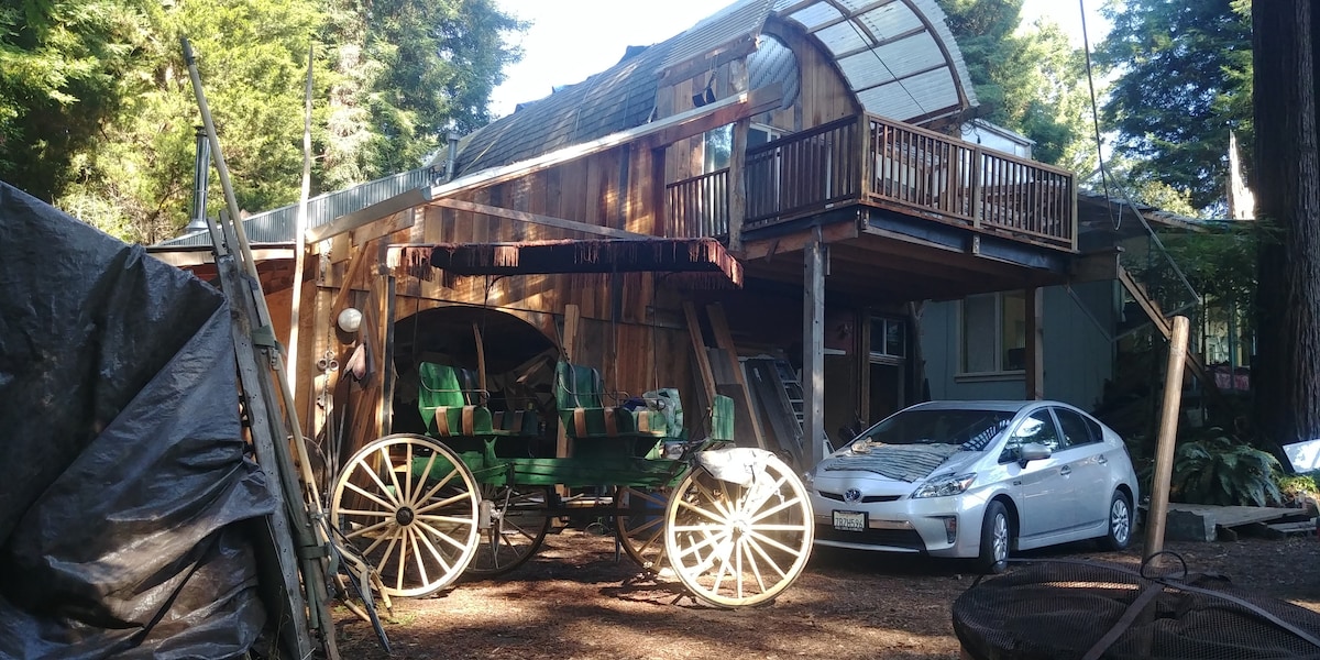 This is the downstairs separate studio unit of Z-Barn on Airbnb and it can be rented together for $2500 per month. It is an old redwood cottage restored, expanded and converted into a unique, cozy space on the base level of the Z-barn. It has a kitchenette with amenities, small refrigerator and double burner propane stove. The space heated quickly by an efficient propane heater. The bed is queen sized. The bathroom access through a 4 step outdoor stairway.