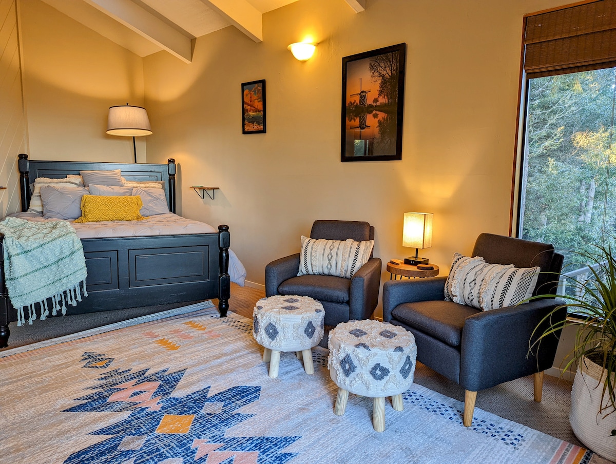Mendocino Coast Studio tucked in the village of Albion is a wonderful getaway. Perched over the Albion River with a bird's eye view of the historic Albion River Bridge and cove beyond for sunsets over the ocean. The sun rises over the river. Goings on down below including seals on the docks. A snug spot to hunker down or a comfy coastal stopover between the Anderson Valley wine region and the Mendocino coast. Please "read more" before booking, 2 guest maximum & no children under the age of 12.